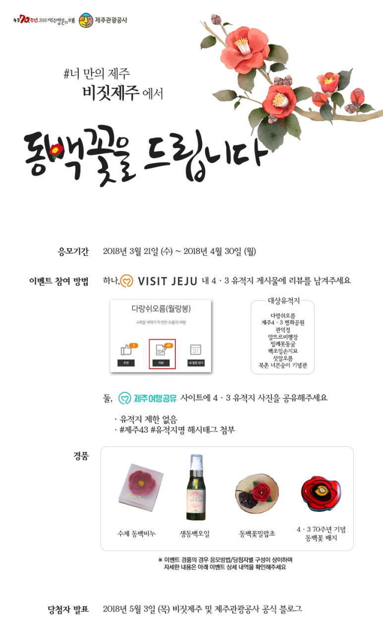 제주여행공유 이미지 업로드 | 수제비누 2구 세트 + 생동백 오일 + 동백꽃 밀랍초 + 동백꽃 배지 (1명) | 내부 블라인드 심사를 통해 4·3의 의미가 가장 잘 담겨있는 응모 작품 1개를 선정 |